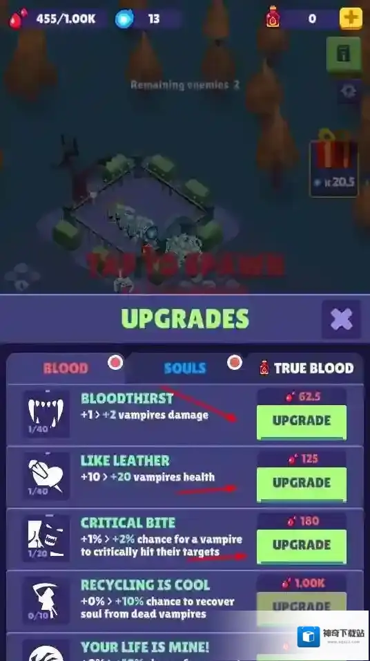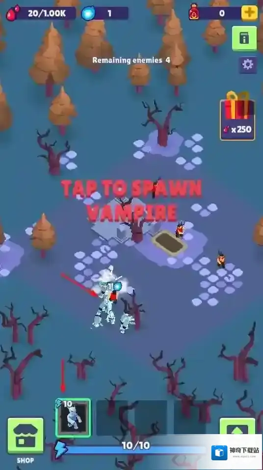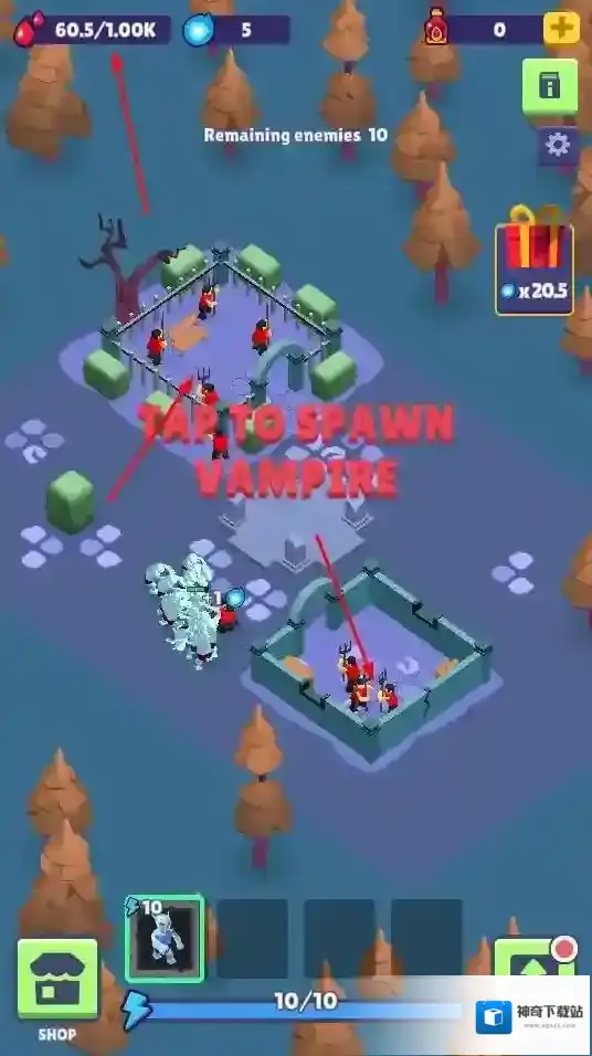1、点击“TAP TO SPAWN VAMPIRE”,消耗资源召唤吸血鬼单位,投入战场对抗敌人,是基础战斗操作。